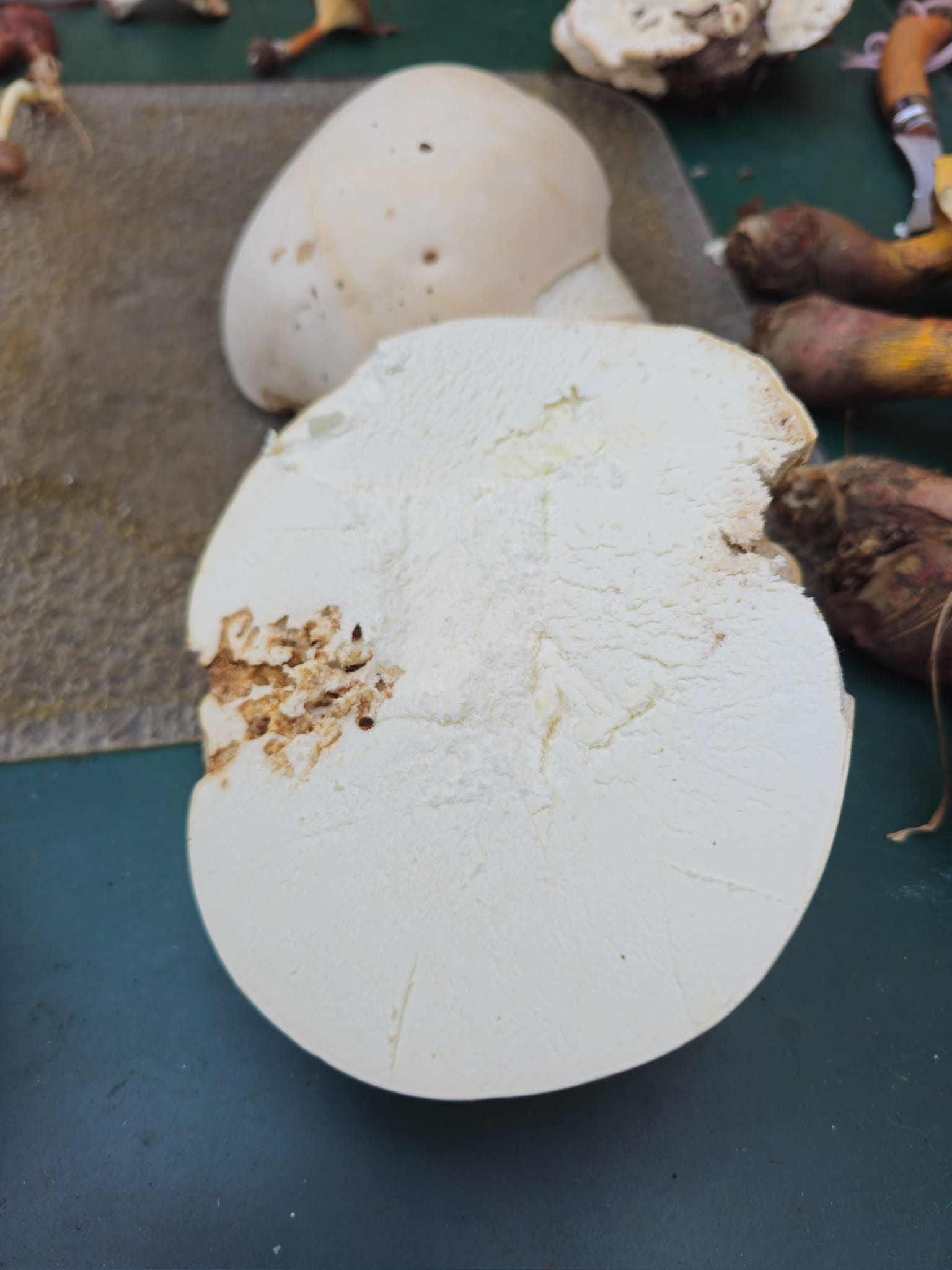 We went to Germany, where the mushroom season had progressed much further, and I was able to tick off a lot of mushrooms I’d not seen before, including the the aforementioned lurid boletes (Suillellus luridus) and the giant puffball (Langermannia gigantea). The latter is a splendid food mushroom which adds a great consistency to the mix. It’s a bit like tofu in the sense that it soaks flavors.